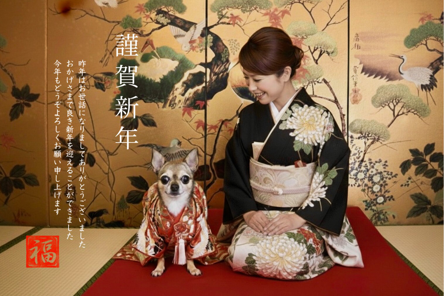 お正月らしい写真がなく、愛犬と私の着物の写真をと今流行りのAIに